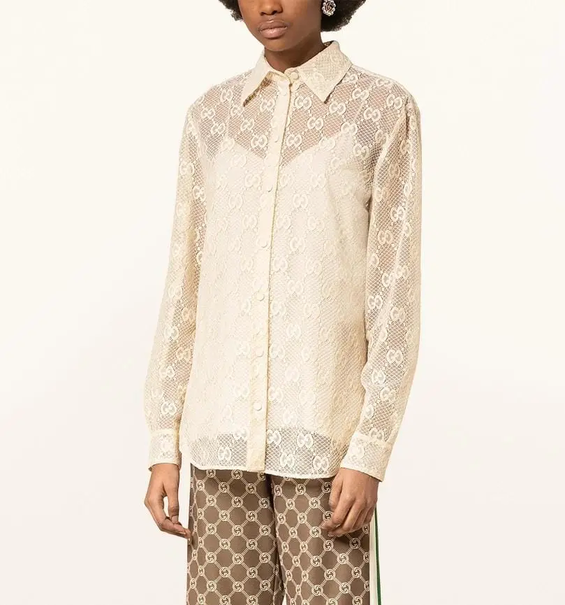 Elevate your wardrobe with the GUCCI Ruffled Embroidered Cotton Lace Shirt for Women—a masterpiece of Italian craftsmanship. This exquisite shirt features delicate lace detailing, intricate embroidery, and elegant ruffled accents, exuding timeless sophistication. Made from premium-quality cotton, it ensures breathable comfort while maintaining a luxurious drape. The refined design, adorned with GUCCI’s signature elegance, makes it a perfect statement piece for both formal and semi-formal occasions. Pair it with tailored trousers or a chic skirt for a polished, high-fashion look.
