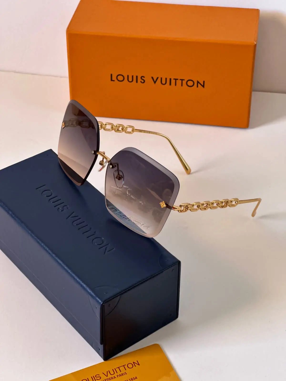 The oversized square shape of this season’s LV Jewel Square sunglasses makes them a standout style. This iteration is balanced by rimless and faceted lenses and includes refined details such as a slender signature chain on the temples. House signatures include LV Initials and Monogram Flowers, which are embedded into the design of the chain.