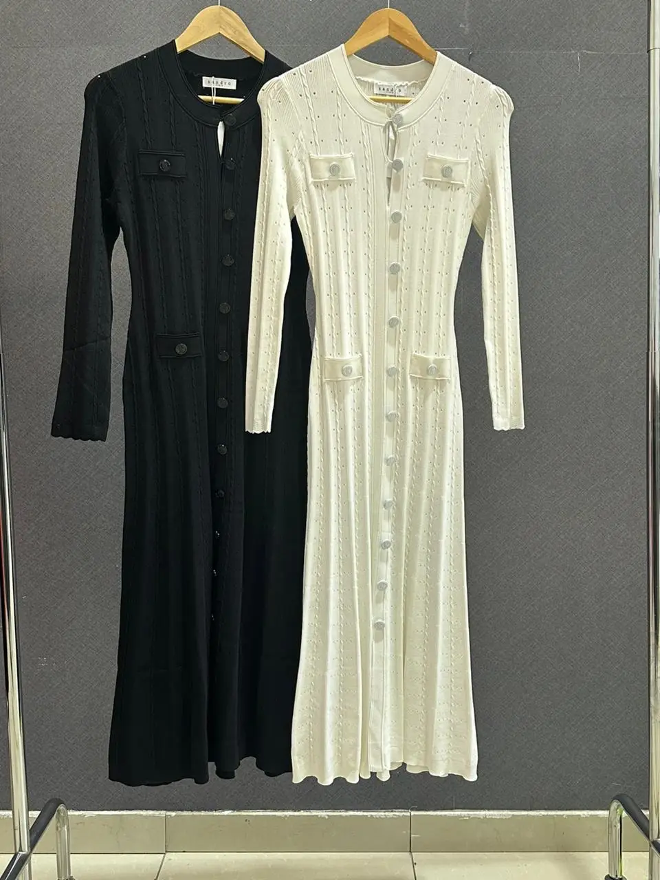 Indulge in the epitome of effortless Parisian elegance with the SANDRO Long Knitted Dress. Meticulously crafted from our exclusive super master quality knit, this dress offers an unparalleled fusion of luxurious comfort and sophisticated style. The fabric is supremely soft, fluid, and possesses a beautiful weight that drapes flawlessly against the body, creating a timeless silhouette that is both forgiving and figure-enhancing.