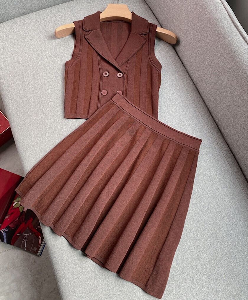 Paired flawlessly with the top is the Pleated Skirt, a symbol of chic, academic-inspired style. Meticulously tailored from a fluid, wrinkle-resistant fabric, it features fine, consistent pleats that dance with movement. The high waist design seamlessly tucks in the tank top, elongating the silhouette for a graceful, feminine figure. This skirt is not just an item; it’s an experience of effortless polish.