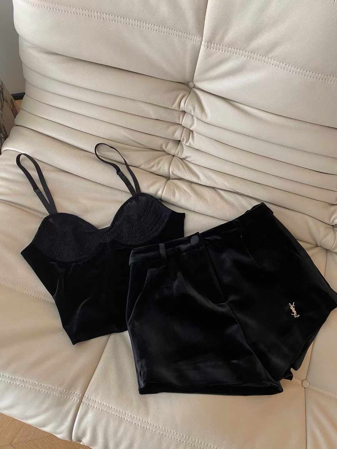 Indulge in the pinnacle of luxury with the YSL Velvet Camisole & Shorts Set. This exquisite ensemble is the epitome of opulent loungewear and effortless evening style. Crafted from sumptuous, high-grade velvet that feels as divine as it looks, the fabric catches the light to create a rich, dimensional sheen.
