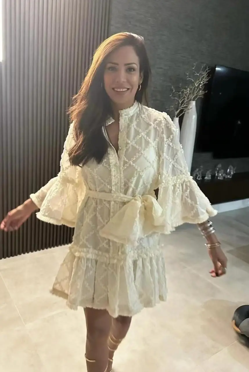 A delicate button-front placket adds a touch of classic, vintage-inspired charm, while the dress’s namesake ruffles cascade from the shoulders and sleeves, delivering a dynamic, eye-catching flourish with every movement. Designed to flatter the silhouette, the fitted bodice and playful mini skirt create a effortlessly chic and confident look.