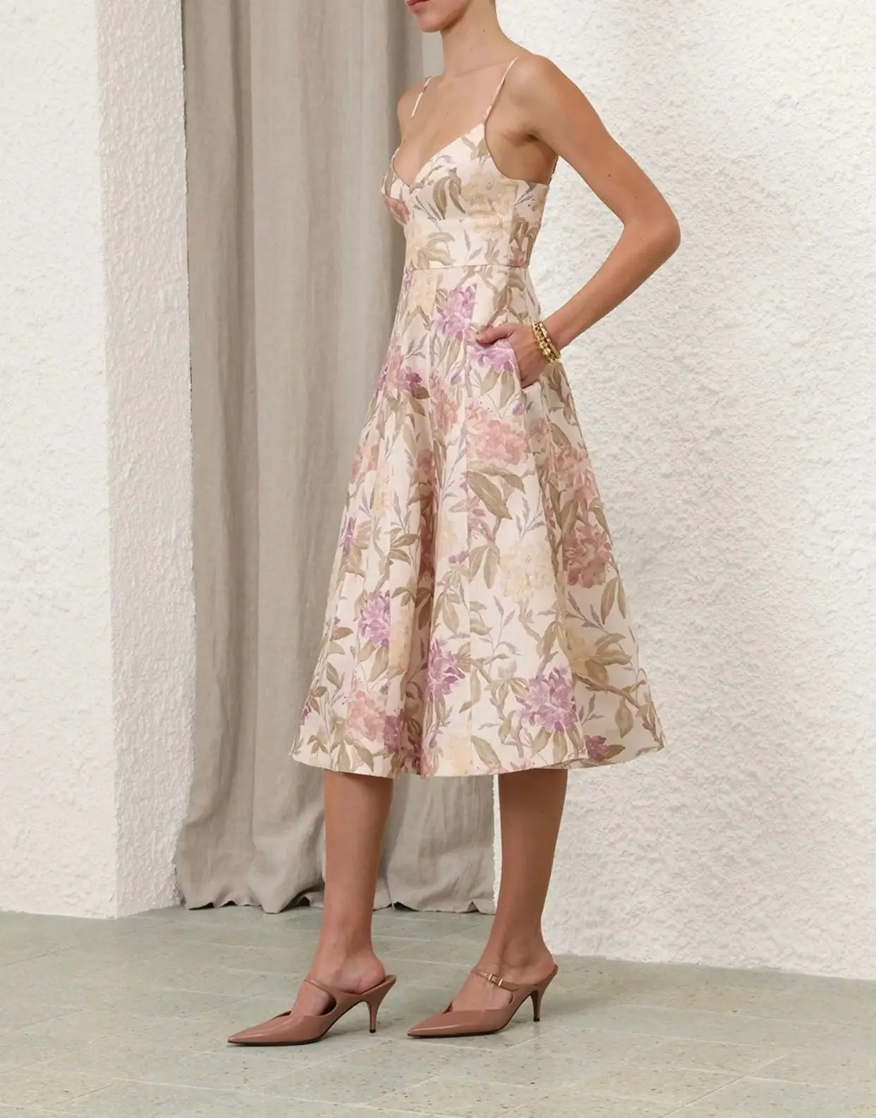 The dress features an exclusive, artistically rendered print that unfolds across the fabric like a storybook illustration. Delicate florals, playful motifs, and a soft, dreamlike color palette create a captivating focal point. Rendered in ZIMMERMAN’s signature super master quality, every detail is exquisitely defined, from the precision of the print registration to the sumptuous hand-feel of the silk-georgette or premium cotton voile.