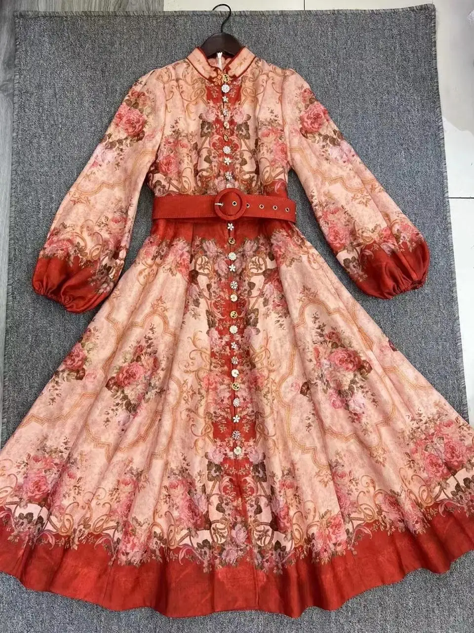 Crafted from an exceptionally soft and fluid fabric, the dress drapes beautifully, offering both effortless comfort and a flattering, feminine shape. The dramatic, billowing sleeves add a touch of romantic volume and movement, perfect for making an entrance. However, the true masterpiece lies in the exquisite front closure—a series of jeweled buttons that catch the light, transforming this dress into a wearable work of art.