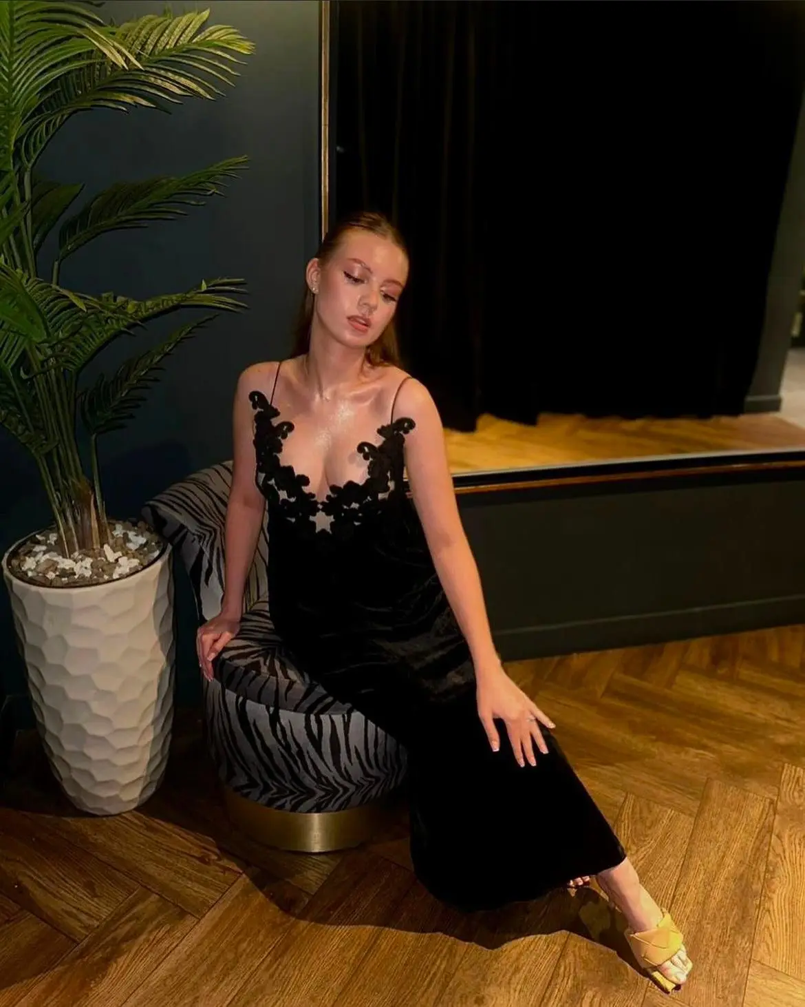 Designed with a fluid, bias-cut silhouette, the dress skims the body gracefully, offering a flattering and comfortable fit from the delicate spaghetti straps to the sweeping midi hem. The gentle decolleté neckline and open back add a touch of timeless glamour, making this piece as perfect for a gala as it is for a sophisticated evening soiree.